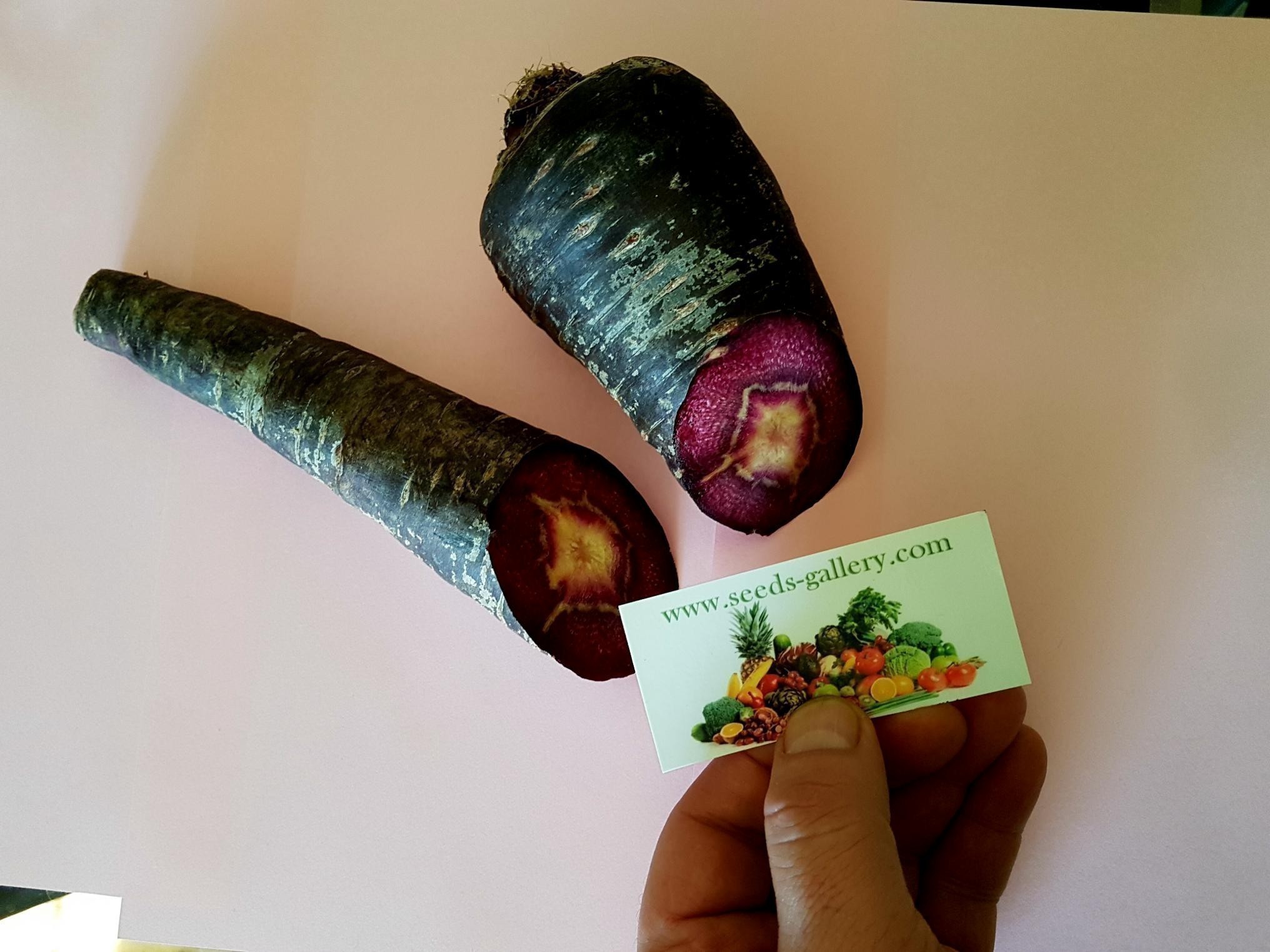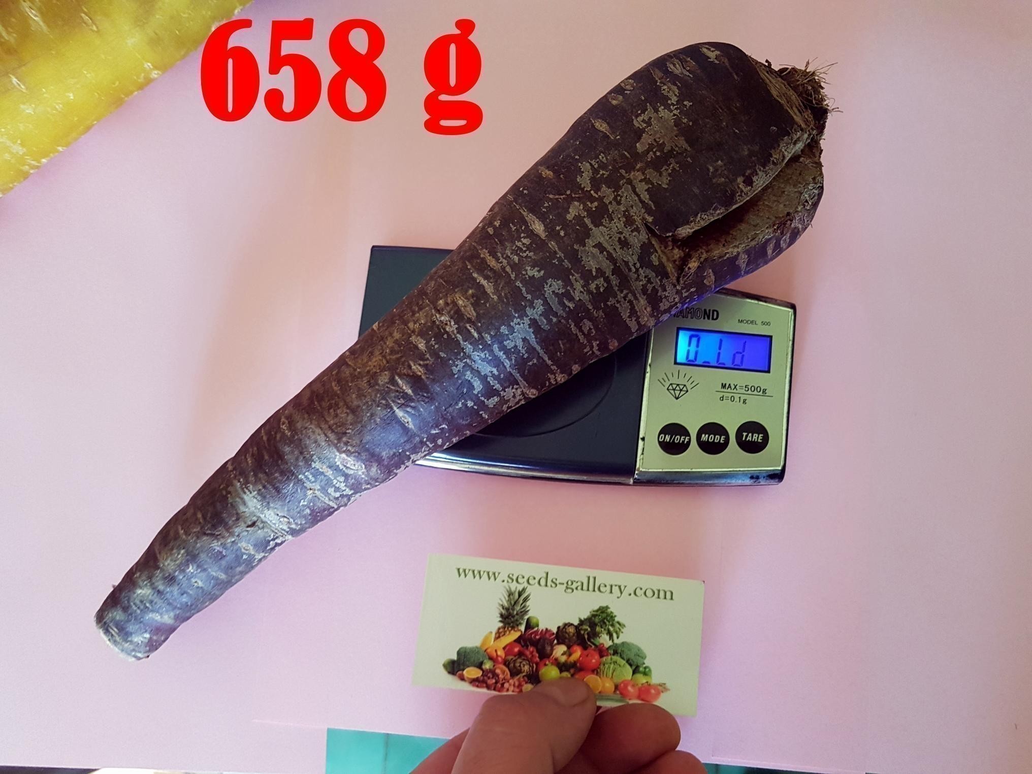 RIESIGE Früchte haben ein Gewicht von 500 g bis 1 kg. Schneiden Sie es, zerkleinern Sie es und lieben Sie es. Diese herrlich süße Riesenmöhre hat die intensivste violette Farbe. Sie werden begeistert sein von dieser einzigartigen, aber leckeren Sorte mit ihrer violetten Farbe. Hat einen hohen Gehalt an Vitaminen und Antioxidantien.