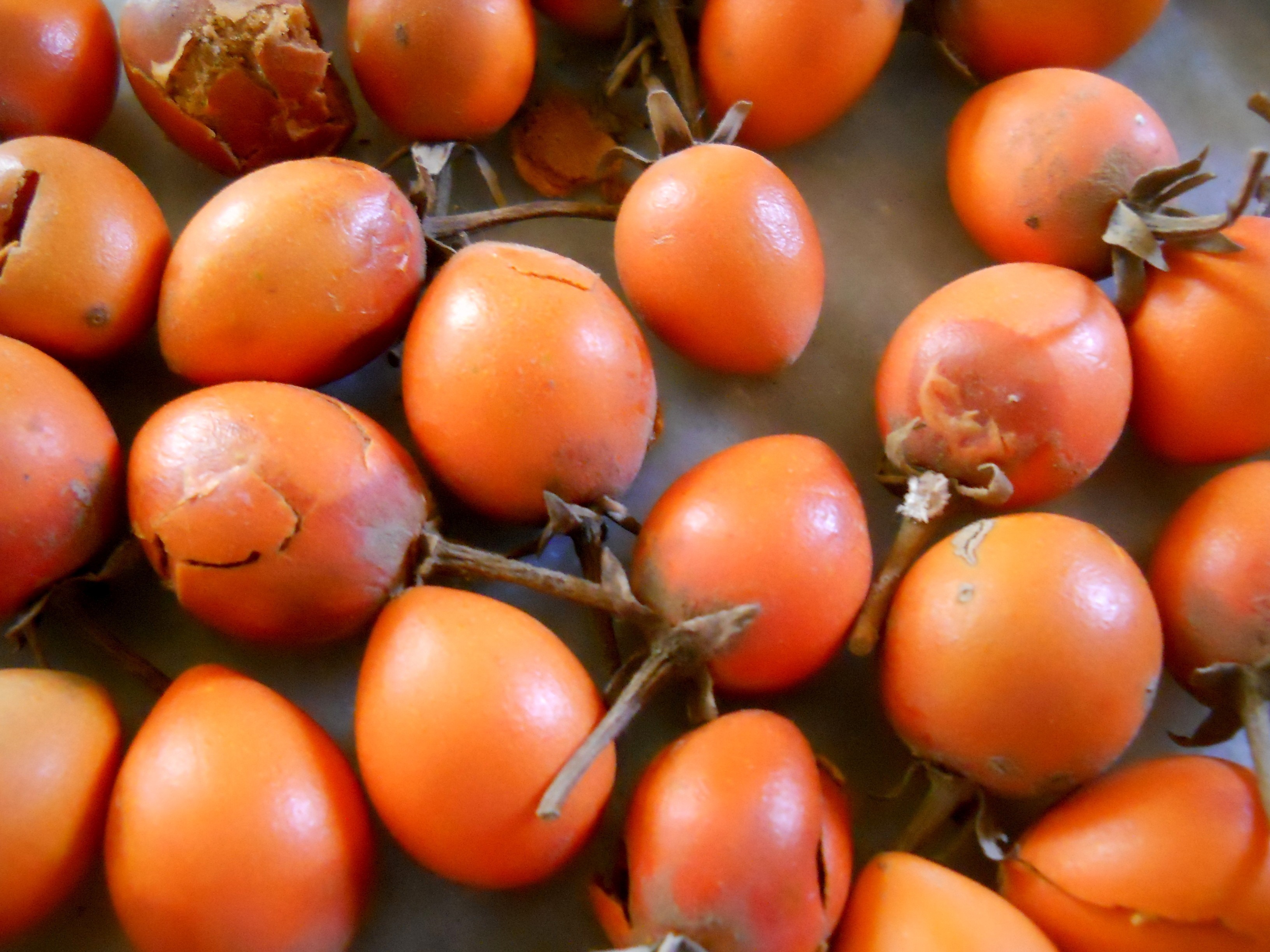 De eetbare vrucht is zacht behaard en wordt glad, ovaal en helder rood-oranje als hij rijp is.