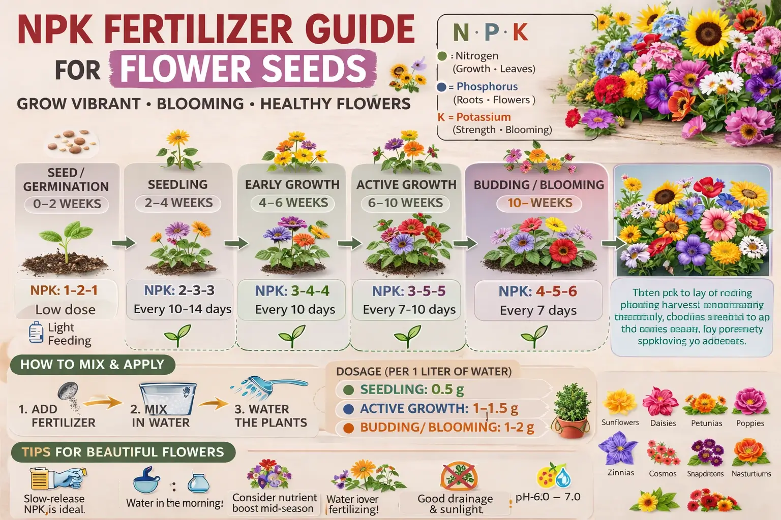 Flowering plants require balanced nutrition for strong growth and abundant blooms. During early vegetative growth use balanced fertilizers such as NPK 3-1-2 to support healthy leaves and roots. When plants begin forming buds increase phosphorus and potassium levels to stimulate flowering and improve flower quality. Apply fertilizer solution every 7–10 days during active growth. Avoid excessive nitrogen because it can promote leaf growth instead of flowers. Maintain well-drained soil and adequate sunlight for the best flowering results.