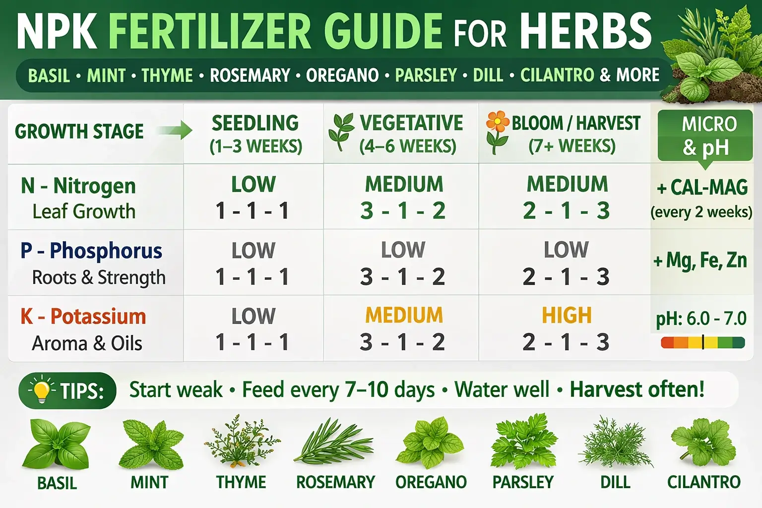 Medicinal herbs such as basil, mint, thyme, oregano, sage and many other aromatic plants require light but regular fertilization. During early growth use balanced fertilizers such as NPK 3-1-2 in small doses to promote healthy leaf development. Apply fertilizer solution every 7–10 days during active growth. Avoid excessive nitrogen because too much nitrogen can reduce the aroma and medicinal compounds of many herbs. Maintain well-drained soil and moderate feeding for the best quality herbs.